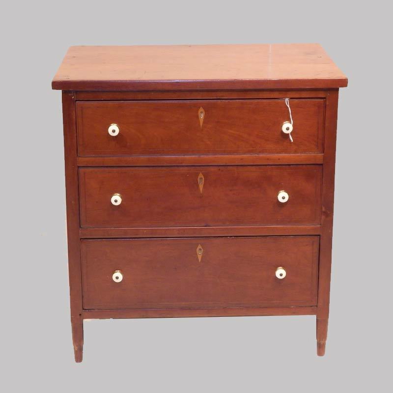 25-11911x, Miniature child's size Sheraton 3 drawer chest with string inlay and escutcheon inlay, New Jersey origin.$1,975