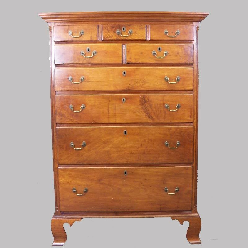 31-20598, Walnut Chippendale high chest, 3 over 2 over 4 drawers, reeding between drawers, quarter columns, ogee feet, Lancaster-York Co., PA.$4,500