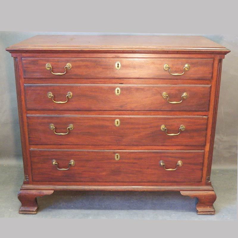 15-24942, Chippendale mahogany four drawer chest, thumb molded top, overlapping drawers, quarter columns, ogee foot, original brasses, Philadelphia PA 1775-90's.$5,950