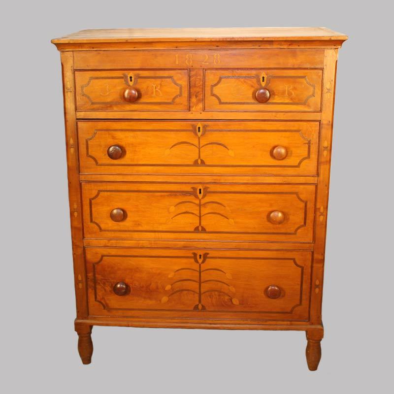 18-32818, Rare unusual chest of drawers. Maple inlayed tulips, acorn, and flowers. Initials JK and CK with 1828 date. Attributed to the Mahantongo Valley PA. Refinished. 48"H x 37 1/2"W x 21"D.$6,950