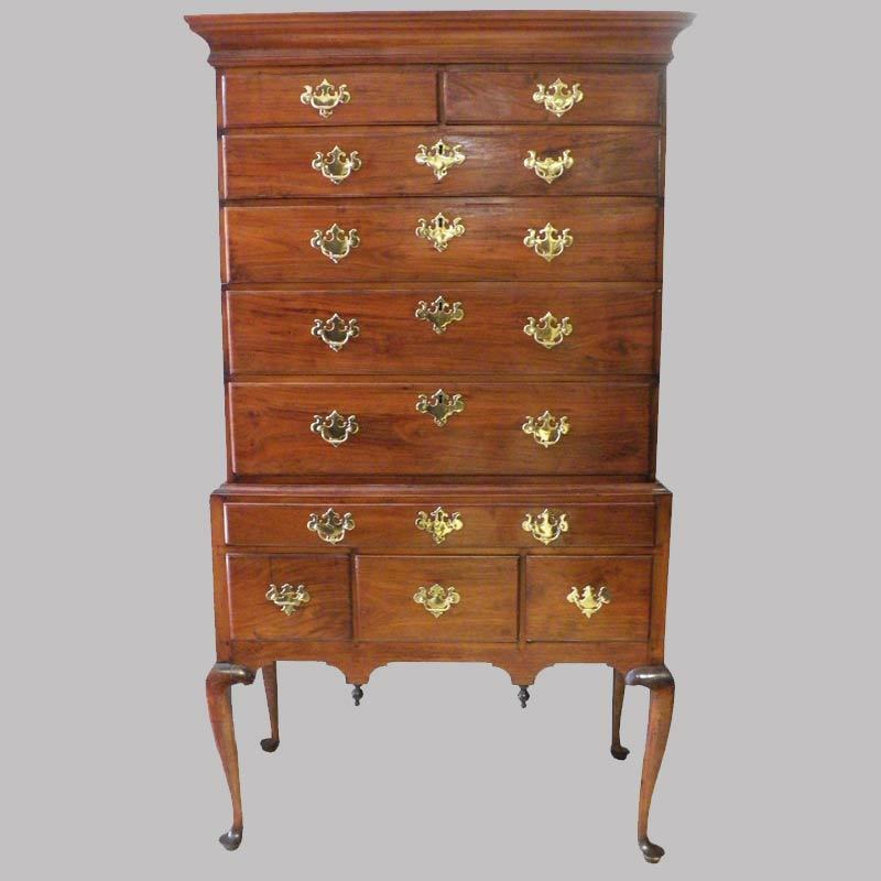 13-22892, New England 2 part Queen Ann high boy, mahogany and maple, resting on pad feet, brasses replaced, probably Mass, 18th century.$7,500