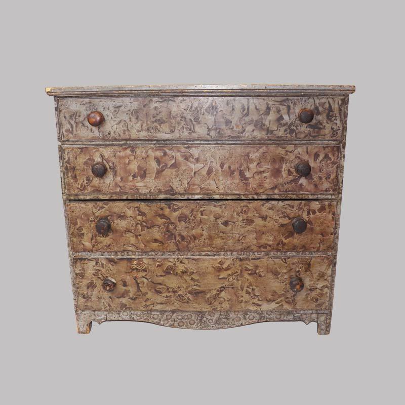 14-23983, New England paint decorated mule chest with 2 drawers, neat color a brown over grey vinegar design.$3,450