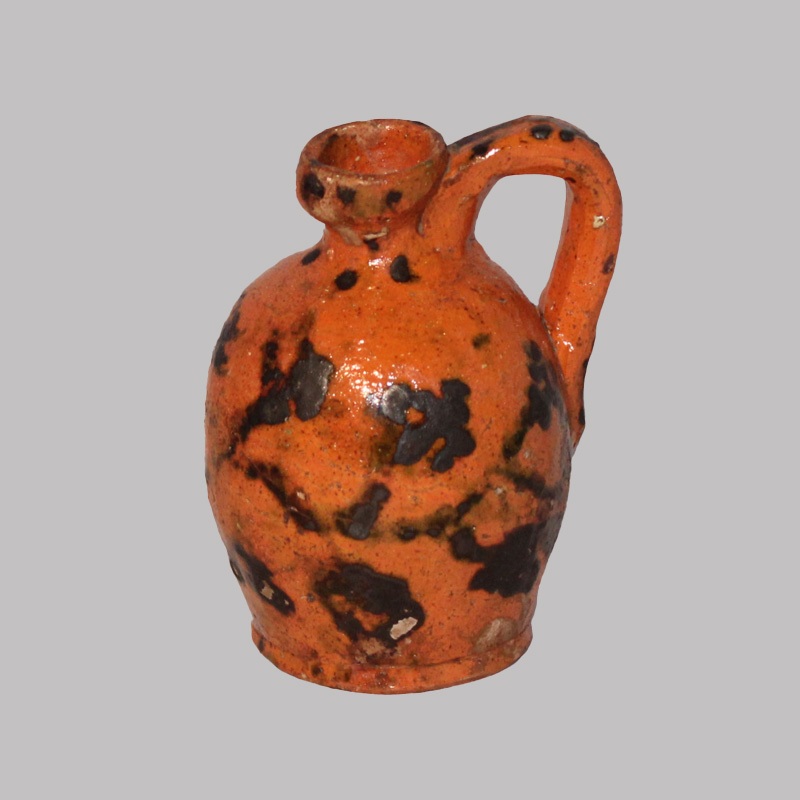 Z-19783 Miniature PA Redware pottery. Ovoid tiny, handled jug. 19th century. 2 1/2"H x 3"W.