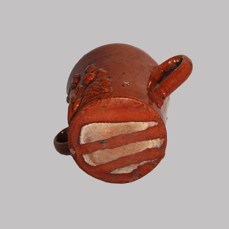 ZZ4-53169 Rare ovoid miniature Redware handled jug, manganese slip, detailed double floral vine decoration. VA or eastern TN. 31/2" x 4"H