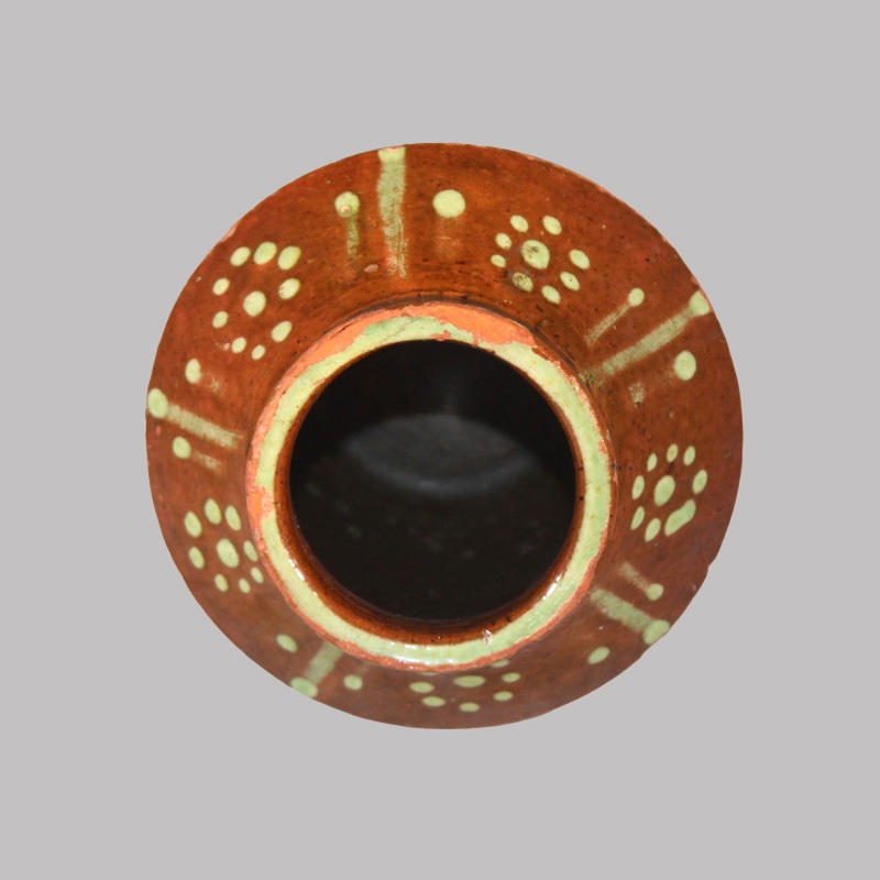 Z-10269x Rare PA Redware pottery jar. Small unusual form, neat green slip decoration. Berks Co.. 5 1/2"H x 5"W.