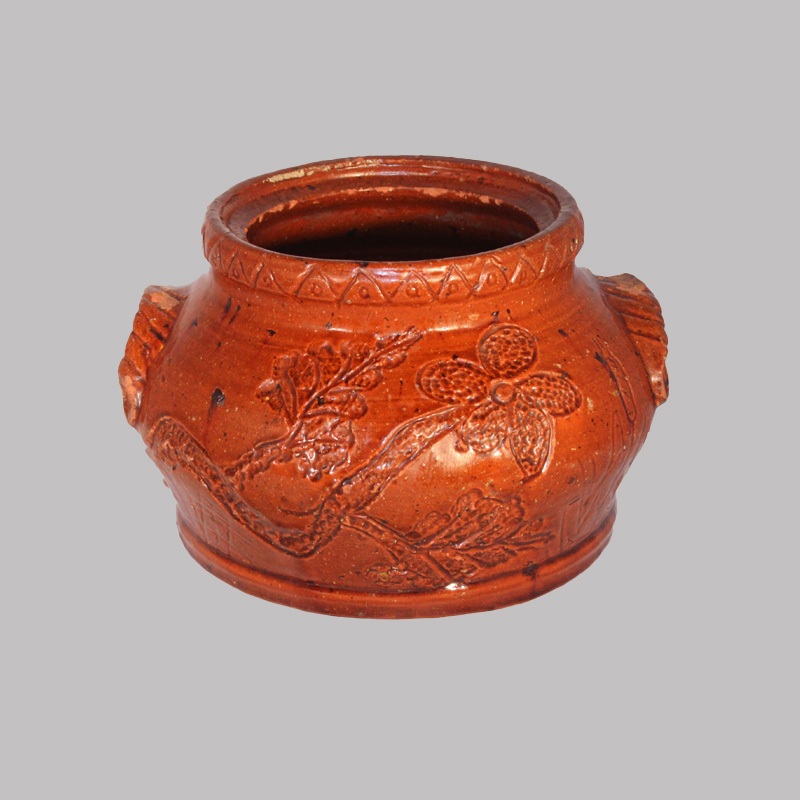 ZZ4-52095 Rare PA Redware pottery. Lope handle pot, sgraffito fully incised floral decoration. Some glaze loss. Early 19th century. 6 1/2"H x 9"L x 7"W.