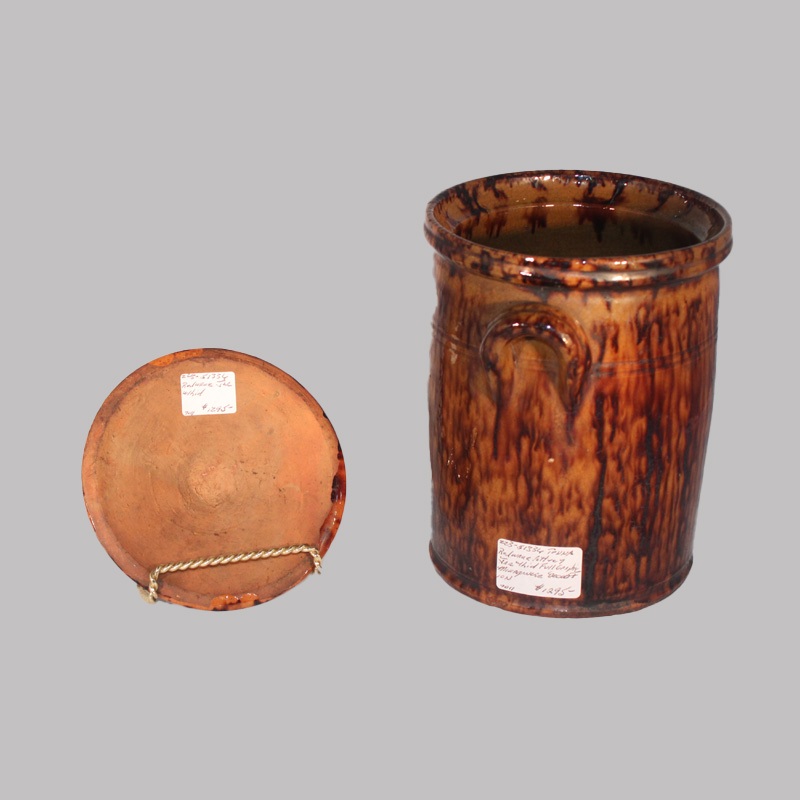 ZZ3-51504 Unusual Redware pottery jar with original lid. Overall yellow slip and brown manganese decoration. PA or MD. Finial chip. 7 1/2" x 6"L