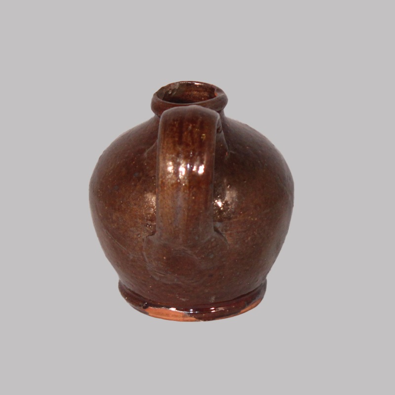 Z-19783 Miniature PA Redware pottery. Ovoid tiny, handled jug. 19th century. 2 1/2"H x 3"W.