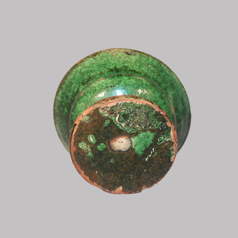 Z-28582 Rare miniature Redware pottery bowl. Overall green slip glaze. Exceptional form. 1"H x 2"W.