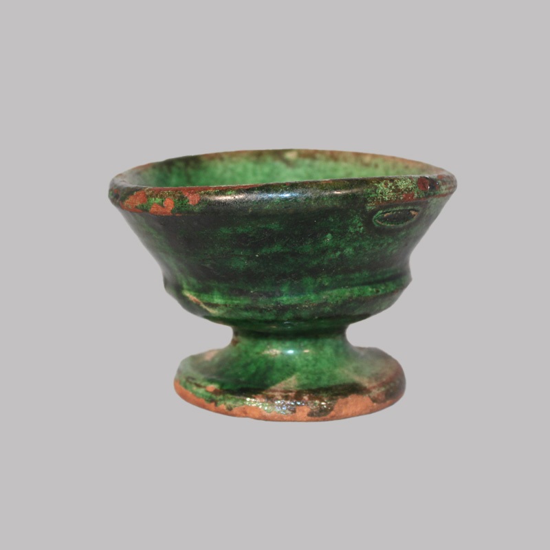 28-18725 Small Redware pottery. Footed salt, unusual green glaze. Found in Manheim, PA. 2"H x 2 1/2"W.