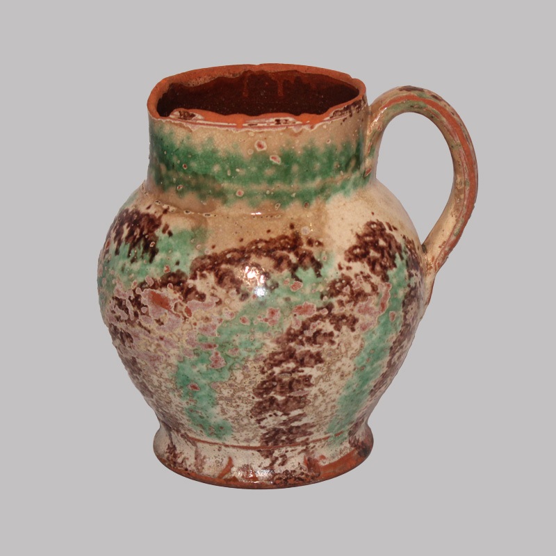 ZZ3-51392 Unusual Redware pottery bulbous pitcher. Rare manganese brush flower decoration, probably Ohio. Some rim wear. 8"H x 7"W $2,950