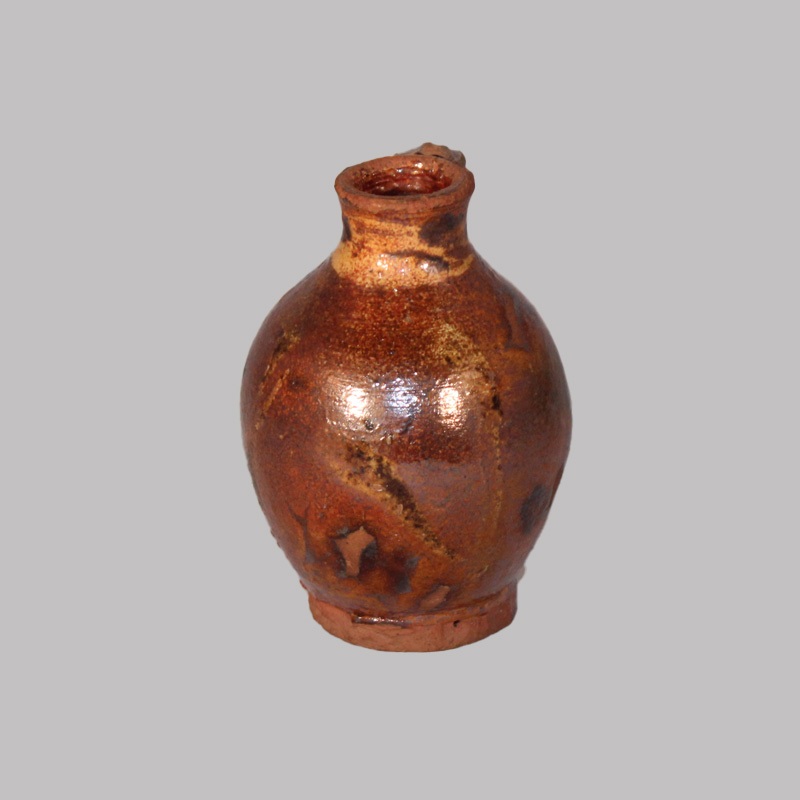 27-16713 Miniature PA Redware pottery ovoid strap handle jug. Good form. 3"H x 3 1/2"W.