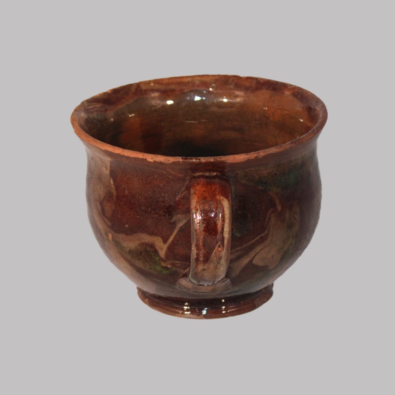 ZZ4-52377 Redware pottery handled mush cup. Rare yellow and green slip decoration. PA or MD. Early-mid 19th century. 3 1/4"H x 4 1/2"W.