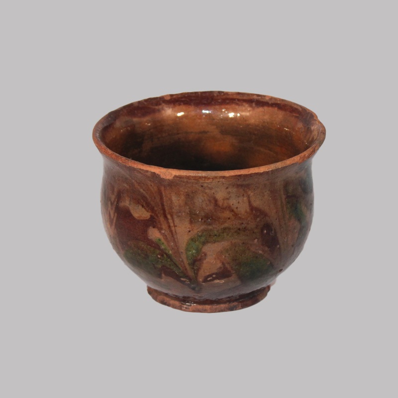 ZZ3-50291 Unusual PA Redware pottery. Footed egg/salt cup. Dark manganese splash decoration. 19th century. 3"H x 2 1/2"W.