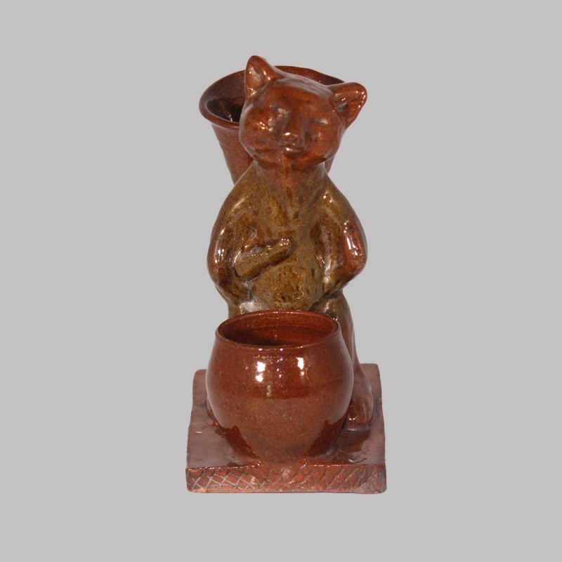 18-32812 Rare PA Redware pottery. Match safe folk art figure of a standing bear. Two-tone glaze. 19th century. 6 1/2"H x 5"W.