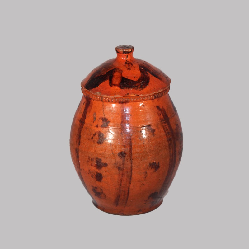 ZZ3-51504 Unusual Redware pottery jar with original lid. Overall yellow slip and brown manganese decoration. PA or MD. Finial chip. 7 1/2" x 6"L $1,495