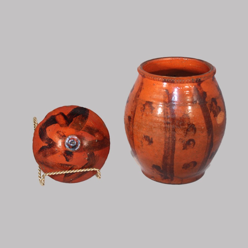 ZZ3-51504 Unusual Redware pottery jar with original lid. Overall yellow slip and brown manganese decoration. PA or MD. Finial chip. 7 1/2" x 6"L $1,495