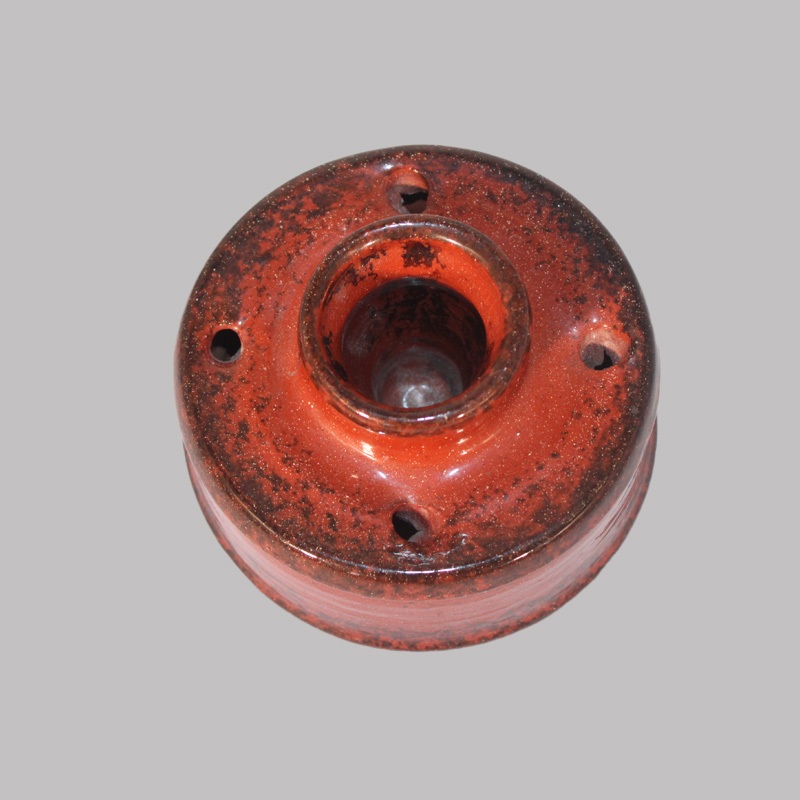 14-23966, PA Redware saucer base fat lamp, rim nick. 4 1/2" high by 6" wide. $1,200