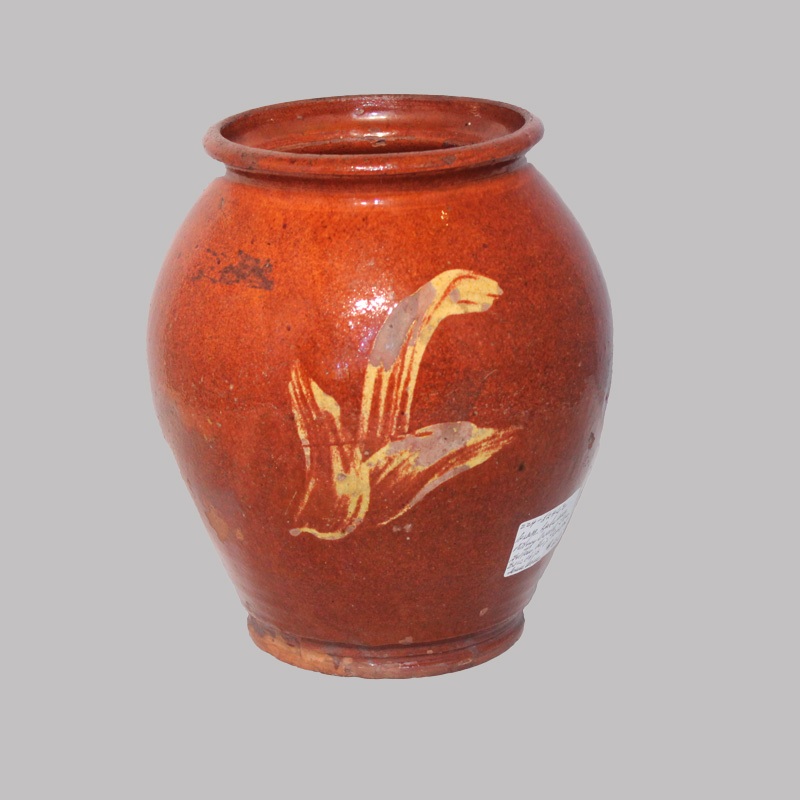ZZ4-52462 PA Redware pottery ovoid jar. Yellow slip, tulips. Base chips and some wear. 8" x 7"