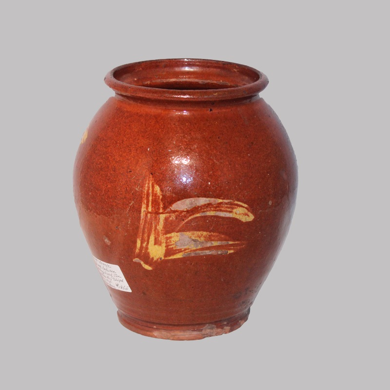 ZZ4-52462 PA Redware pottery ovoid jar. Yellow slip, tulips. Base chips and some wear. 8" x 7"